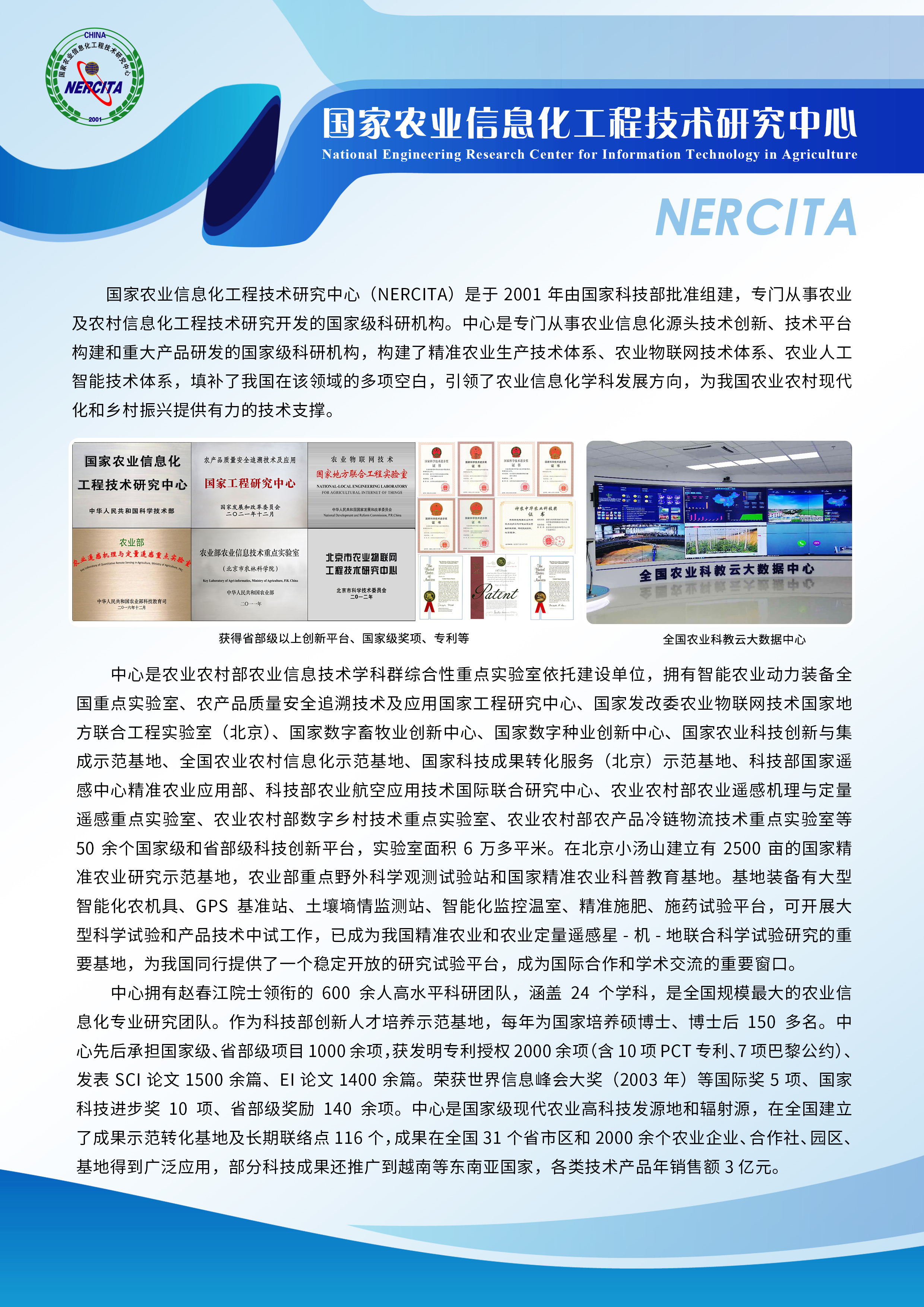 國家農業智能裝備工程技術研究中心(NERCIEA)是在北京市農林科學院智能裝備技術研究中心的基礎上于2009年組建。該中心根據世界農業智能裝備的發展趨勢和我國現代農業發展的需要,針對我國農業智能裝備重要關鍵性、基礎性和共性技術問題,進行系統化、配套化和工程化研究開發,建設農業智能裝備數字化設計與測試技術平臺,突破農業智能裝備設計、加工、制造關鍵技術,開發適應我國不同生產規模和經營方式的農業智能裝備系列技術產品,為我國現代農業發展提供物化的技術支撐,提升我國農業智能裝備水平。