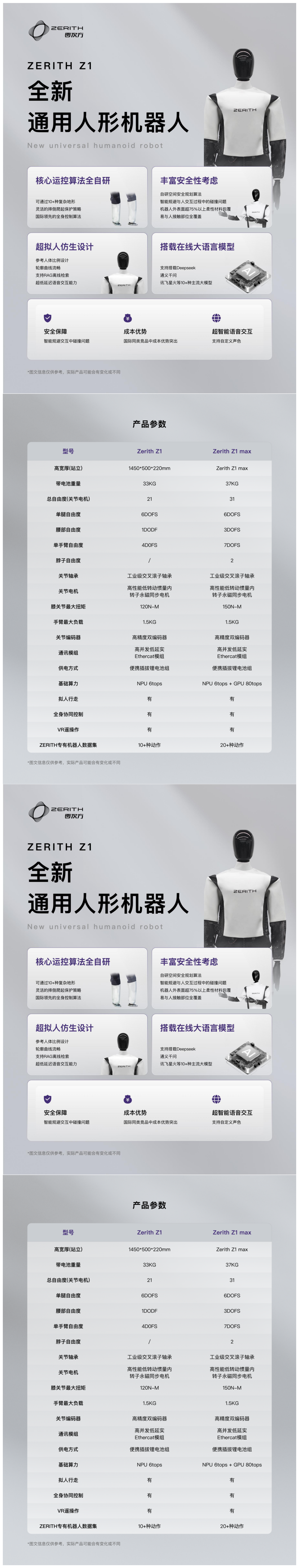 ZERITH Z1是一款全新通用人形機器人,采用超擬人仿生設(shè)計,參考人體比例打造流暢輪廓。核心搭載全自研運控算法,配備31個全身自由度實現(xiàn)類人靈活運動,支持10+種復(fù)雜地形行走并具備摔倒爬起保護能力。具備超低延遲語音交互與自定義音色功能;通過腕部深度相機及空間安全算法智能規(guī)避人機碰撞。