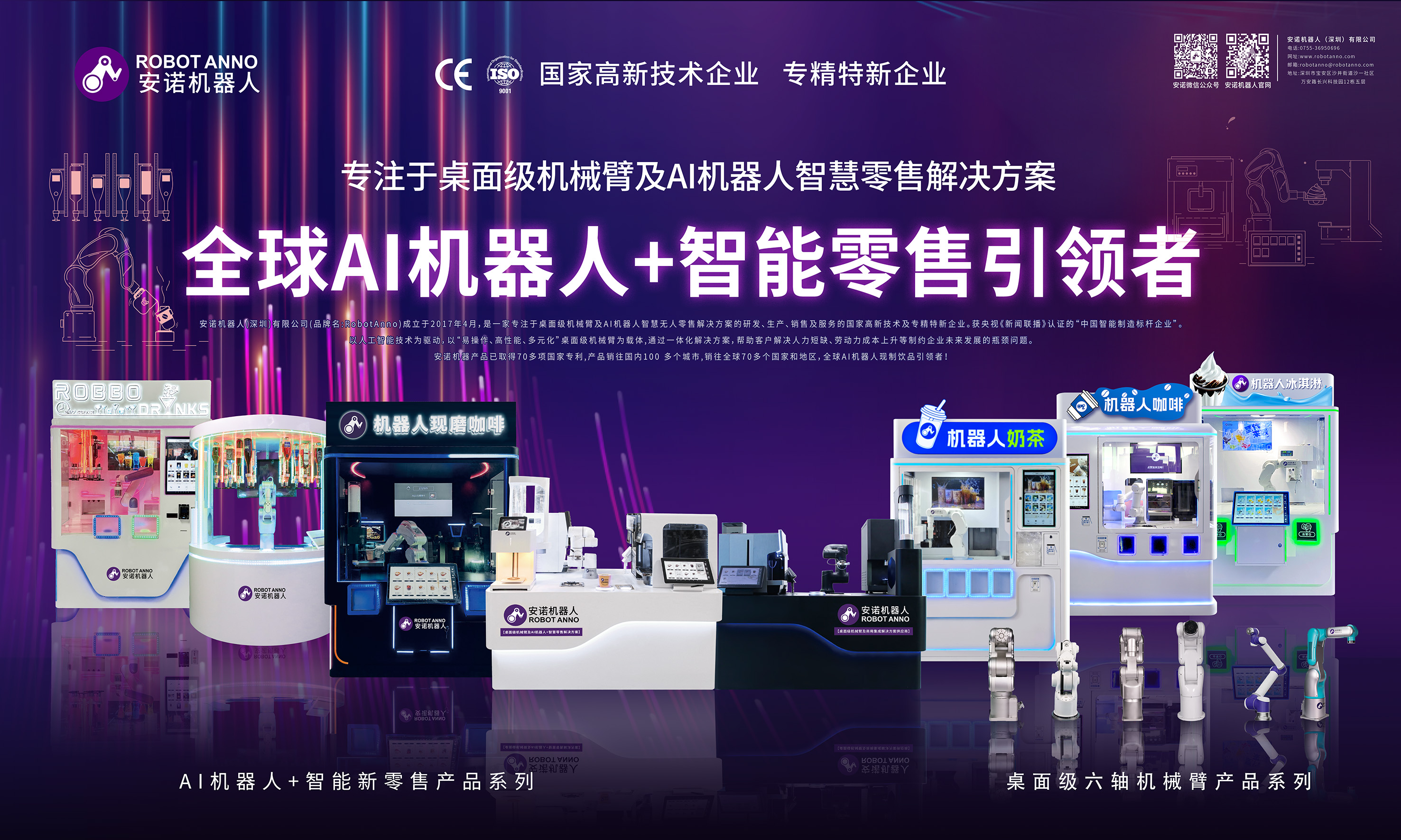 安諾機器人(深圳)有限公司(品牌名:RobotAnno)成立于2017年4月,是一家專注于桌面級機械臂及AI機器人智慧無人零售解決方案的研發、生產、銷售及服務的國家高新技術及專精特新企業。獲央視《新聞聯播》認證的“中國智能制造標桿企業”。 依托自研機械臂及控制系統,通過一系列核心技術來實現機器人智慧無人零售的自動化運營。形成產品矩陣AI機器人拉花咖啡、奶茶、調酒、冰淇淋等機器人現制飲品應用解決方案,產品性能已達到國際領先水平,解決現制飲品無人替代的難題。 安諾機器產品已取得70多項國家專利,產品銷往國內100多個城市,銷往全球70多個國家和地區,全球AI機器人現制飲品引領者!